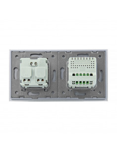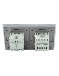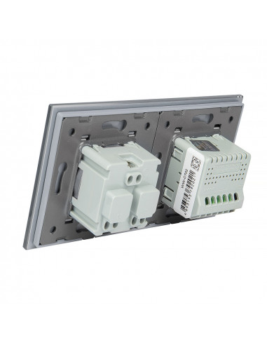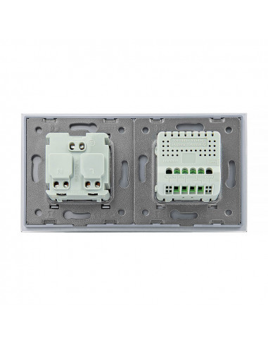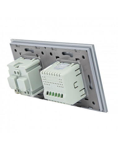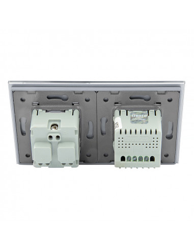 Zestaw składa się z eleganckiego, szklanego panelu dotykowego Livolo, jednego włącznika podwójnego WW-C702, jednego gniazda z bolcem WG-71FR, dopasowanego kolorystycznie do szklanego frontu oraz klapki hermetycznej.