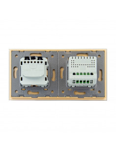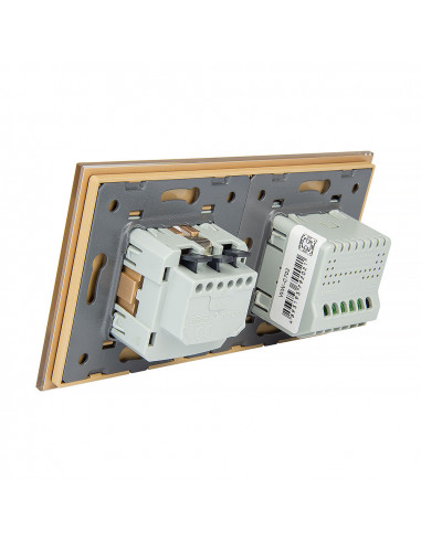 Zestaw umożliwia wygodne sterowanie dwoma niezależnymi obwodami oświetleniowymi oraz korzystanie z jednego gniazda zasilającego, a wszystko to umieszczone w eleganckim, szklanym panelu o spójnym i nowoczesnym wyglądzie. Konstrukcja została zaprojektowana tak, aby zmieścić się w dwóch standardowych puszkach elektrycznych o standardowym rozstawie lub jednej podwójnej puszce zespolonej. Gniazdo wyposażono w uziemienie boczne, które jest kompatybilne ze wszystkimi wtyczkami dostępnymi na rynku europejskim.