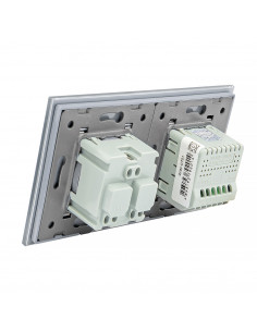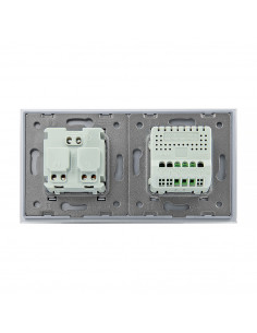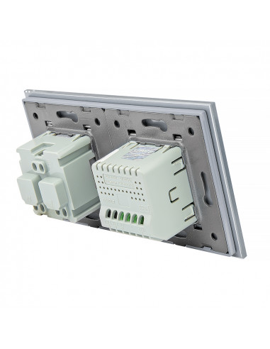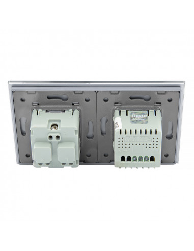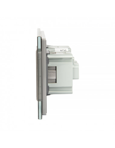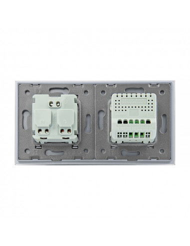 Zestaw umożliwia wygodne sterowanie jednym obwodem oświetleniowym oraz korzystanie z jednego gniazda zasilającego, a wszystko to umieszczone w eleganckim, szklanym panelu o spójnym i nowoczesnym wyglądzie. Konstrukcja została zaprojektowana tak, aby zmieścić się w dwóch standardowych puszkach elektrycznych lub jednej podwójnej puszce zespolonej. Gniazdo wyposażono w klasyczne uziemienie typu „bolec”, co gwarantuje pełną zgodność z dostępnymi wtyczkami na polskim rynku.