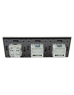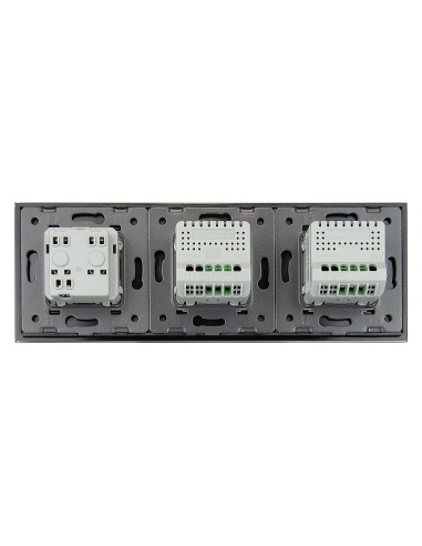Zestaw umożliwia obsługę dwóch oddzielnych obwodów oświetleniowych oraz korzystanie z jednego gniazda zasilającego, a wszystko to znajduje się w eleganckim, jednolitym panelu szklanym. Ten nowoczesny moduł łączy w sobie estetykę, wysoką funkcjonalność i komfort codziennego użytkowania. Konstrukcja jest przystosowana do montażu w trzech standardowych puszkach instalacyjnych lub w jednej potrójnej puszce zespolonej. Gniazdo zostało wyposażone w uziemienie w postaci bolca, dzięki czemu współpracuje z każdą wtyczką.