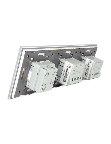 Zestaw umożliwia obsługę dwóch oddzielnych obwodów oświetleniowych oraz korzystanie z jednego gniazda zasilającego, a wszystko to znajduje się w eleganckim, jednolitym panelu szklanym. Ten nowoczesny moduł łączy w sobie estetykę, wysoką funkcjonalność i komfort codziennego użytkowania. Konstrukcja jest przystosowana do montażu w trzech standardowych puszkach instalacyjnych lub w jednej potrójnej puszce zespolonej. Gniazdo zostało wyposażone w uziemienie w postaci bolca, dzięki czemu współpracuje z każdą wtyczką.