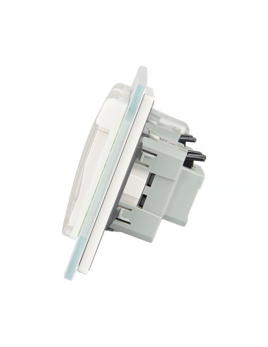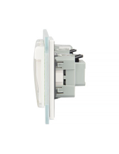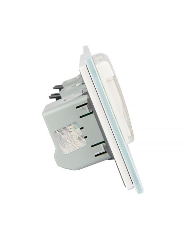 To rozwiązanie umożliwia sterowanie dwoma niezależnymi źródłami światła oraz podłączenie dwóch urządzeń elektrycznych, wszystko za pomocą jednego, eleganckiego panelu szklanego. Panel ten łączy w sobie nowoczesny design, wysoką funkcjonalność i komfort użytkowania. Całość można zamontować w trzech standardowych puszkach elektrycznych z typowym rozstawem lub w jednej, zespolonej puszce na trzy mechanizmy. Gniazdko wyposażono w boczne uziemienie typu Schuko, kompatybilne ze wszystkimi wtyczkami stosowanymi na rynku europejskim. Włącznik świeci się na niebiesko, kiedy jest wyłączony, natomiast na czerwono, gdy jest włączony.