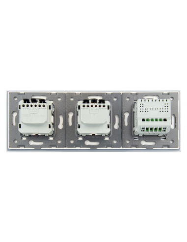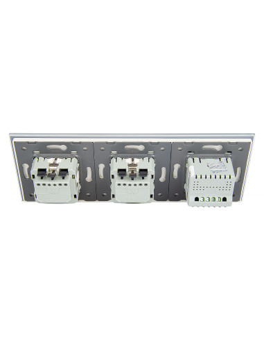 Zestaw składa się z eleganckiego, szklanego panelu dotykowego Livolo, jednego włącznika podwójnego WW-C702 (świecznikowego), dwóch wkładów gniazda pojedynczego WG-71EU-S, dopasowanego kolorystycznie do szklanego frontu oraz dwóch klapek hermetycznych.