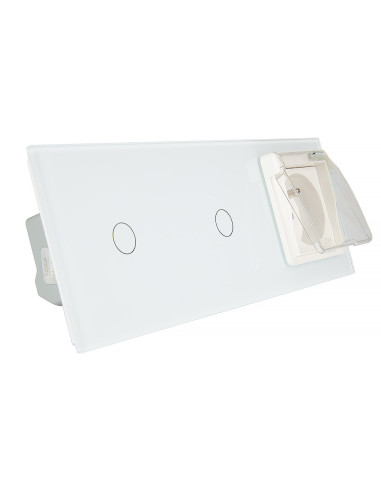 Zestaw składa się z eleganckiego, szklanego panelu dotykowego Livolo, dwóch włączników pojedynczych WW-C701, jednego wkładu gniazda pojedynczego WG-71FR, dopasowanego kolorystycznie do szklanego frontu oraz klapki hermetycznej.