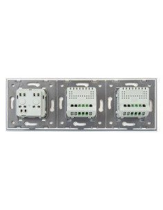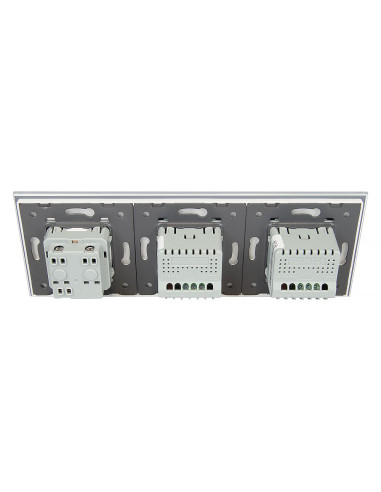 Takie rozwiązanie pozwala na kontrolę dwóch niezależnych źródeł światła oraz podłączenie jednej wtyczki, a to wszystko za pomocą jednego, zintegrowanego panelu szklanego, który łączy w sobie nowoczesny design, wygodę użytkowania i funkcjonalność. Całość mieści się w trzech puszkach elektrycznych o standardowym rozstawie lub w jednej zespolonej puszce na 3 mechanizmy. Gniazdko posiada klasyczne uziemienie w bolcu, kompatybilne ze wszystkimi wtyczkami dostępnymi na rynku europejskim.