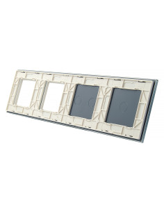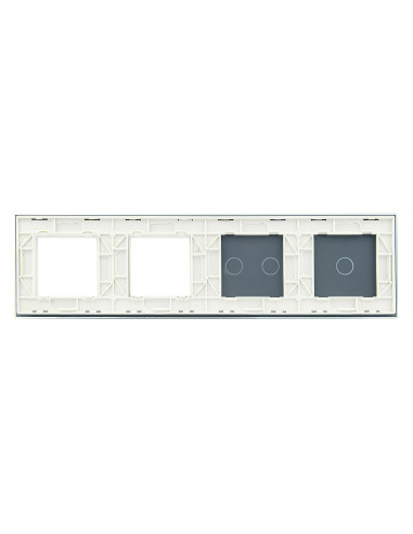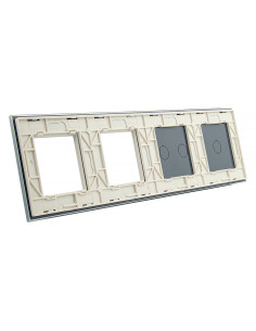 Panel ma miejsce na dwa dowolne włączniki Livolo z pojedynczym i podwójnym przyciskiem oraz dwa otwory na urządzenia takie jak gniazdka, termostaty, czy gniazdka TV lub sieciowe - dostępne w naszej ofercie. Panel jest przystosowany na 4 puszki elektryczne o standardowym rozstawie lub jedną poczwórną zespoloną puszkę.