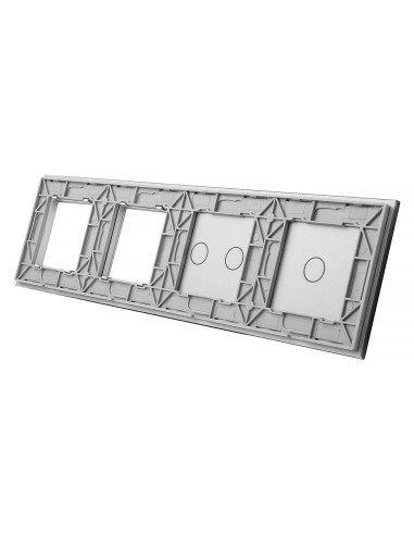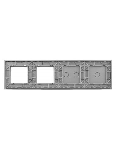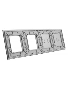 Panel ma miejsce na dwa dowolne włączniki Livolo z pojedynczym i podwójnym przyciskiem oraz dwa otwory na urządzenia takie jak gniazdka, termostaty, czy gniazdka TV lub sieciowe - dostępne w naszej ofercie. Panel jest przystosowany na 4 puszki elektryczne o standardowym rozstawie lub jedną poczwórną zespoloną puszkę.