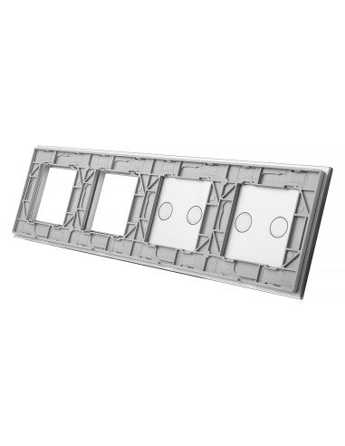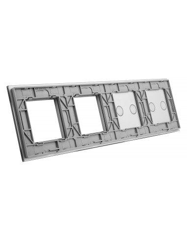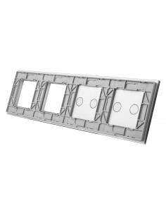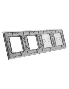Panel ma miejsce na dwa dowolne włączniki Livolo z podwójnymi przyciskami oraz dwa otwory na urządzenia takie jak gniazdka, termostaty, czy gniazdka TV lub sieciowe - dostępne w naszej ofercie. Panel jest przystosowany na 4 puszki elektryczne o standardowym rozstawie lub jedną poczwórną zespoloną puszkę.