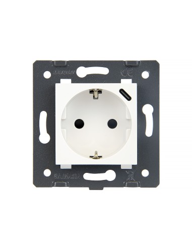 Moduł gniazda wtykowego z uziemieniem bocznym typu Schuko z wbudowaną ładowarką w standardzie USB C, umieszczonej w prawym górnym rogu obudowy. Takie rozwiązanie umożliwia ładowanie urządzeń elektronicznych bez konieczności zajmowania wtyku gniazdka. To świetne rozwiązanie w miejscach, w których nie mamy możliwości zainstalowania podwójnych gniazdek. Moduł gniazda jest dopasowany do wszystkich ramek GPF oraz paneli z wycięciami na gniazdka, które dostępne są w naszej ofercie - dzięki temu możesz stworzyć układ gniazdek i włączników dopasowany idealnie do Twoich potrzeb. Moduł przystosowany do montażu w pojedynczej, standardowej puszce elektrycznej.