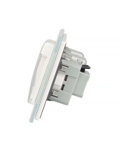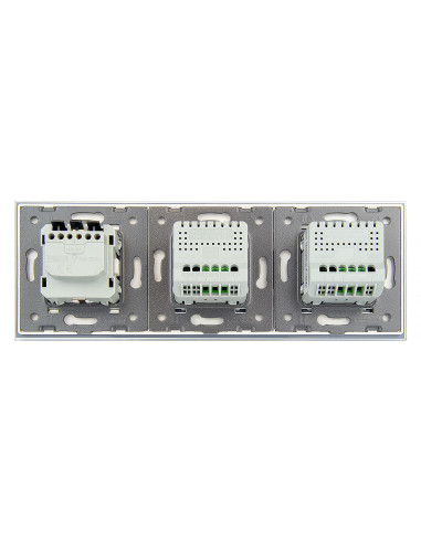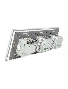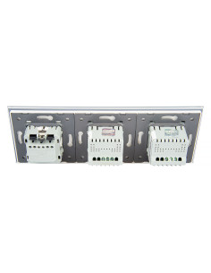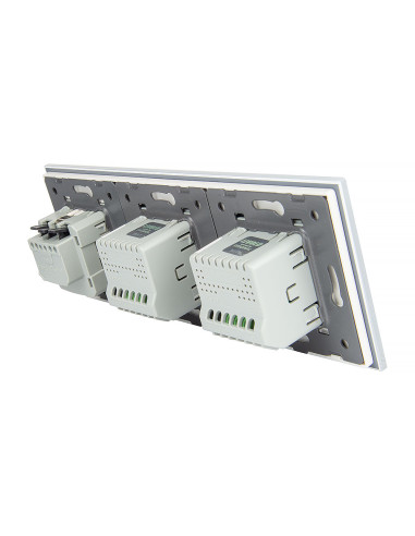 Takie rozwiązanie umożliwia wygodne sterowanie dwoma niezależnymi źródłami światła oraz podłączenie jednej wtyczki, a wszystko to w ramach jednego, eleganckiego panelu szklanego. Panel łączy nowoczesny design z wysoką funkcjonalnością i komfortem użytkowania. Całość mieści się w trzech standardowych puszkach elektrycznych o typowym rozstawie lub w jednej, zespolonej puszce na trzy mechanizmy.