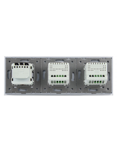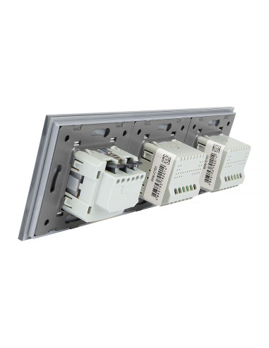 Takie rozwiązanie umożliwia wygodne sterowanie dwoma niezależnymi źródłami światła oraz podłączenie jednej wtyczki, a wszystko to w ramach jednego, eleganckiego panelu szklanego. Panel łączy nowoczesny design z wysoką funkcjonalnością i komfortem użytkowania. Całość mieści się w trzech standardowych puszkach elektrycznych o typowym rozstawie lub w jednej, zespolonej puszce na trzy mechanizmy.