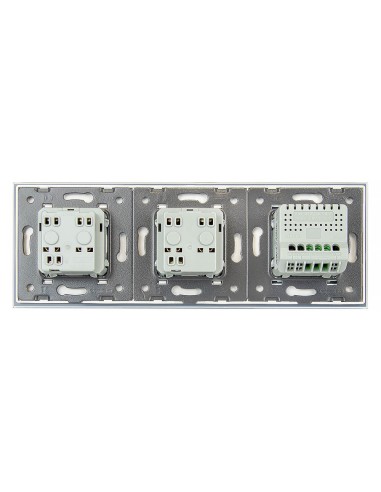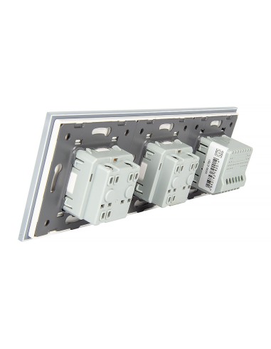 Zestaw umożliwia wygodne sterowanie jedynym obwodem oświetleniowymi oraz korzystanie z dwóch gniazd zasilających, a wszystko to umieszczone w eleganckim, szklanym panelu o spójnym i nowoczesnym wyglądzie. Konstrukcja została zaprojektowana tak, aby zmieścić się w trzech standardowych puszkach elektrycznych lub jednej potrójnej puszce podtynkowej. Gniazda wyposażono w klasyczne uziemienie typu „bolec”, co gwarantuje pełną zgodność z dostępnymi wtyczkami na polskim rynku.