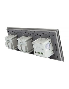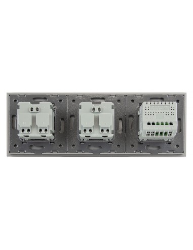Zestaw umożliwia wygodne sterowanie jedynym obwodem oświetleniowymi oraz korzystanie z dwóch gniazd zasilających, a wszystko to umieszczone w eleganckim, szklanym panelu o spójnym i nowoczesnym wyglądzie. Konstrukcja została zaprojektowana tak, aby zmieścić się w trzech standardowych puszkach elektrycznych lub jednej potrójnej puszce podtynkowej. Gniazda wyposażono w klasyczne uziemienie typu „bolec”, co gwarantuje pełną zgodność z dostępnymi wtyczkami na polskim rynku.