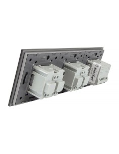 Zestaw składa się z eleganckiego, szklanego panelu dotykowego Livolo, jednego włącznika pojedynczego WW-C701, dwóch wkładów gniazda pojedynczego WG-71FR, dopasowanego kolorystycznie do szklanego frontu oraz klapki hermetycznej.