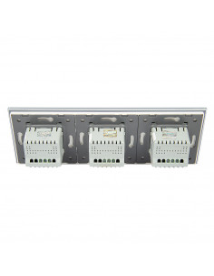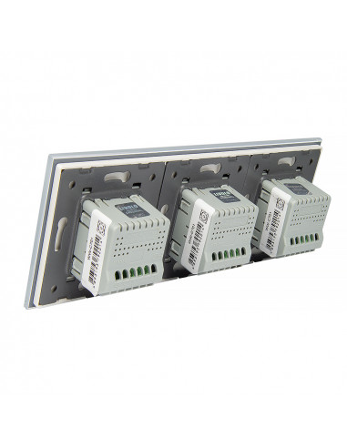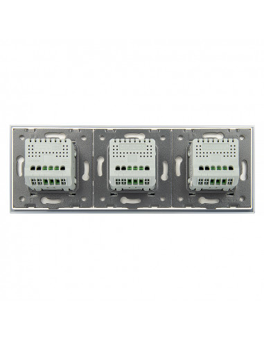 Takie rozwiązanie umożliwia sterowanie trzema niezależnymi źródłami światła z poziomu jednego, zintegrowanego panelu szklanego, który łączy w sobie nowoczesny design, funkcjonalność i wygodę obsługi. Zestaw można zamontować w trzech standardowych puszkach elektrycznych lub w jednej potrójnej puszce zespolonej, co gwarantuje estetyczny i spójny wygląd ściany.