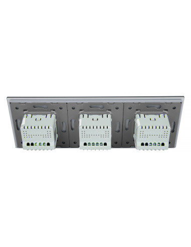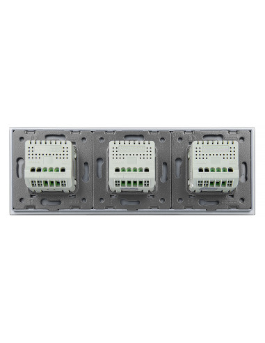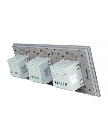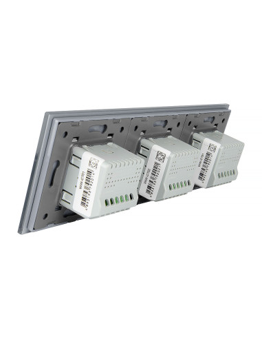 Zestaw składa się z eleganckiego, szklanego panelu dotykowego Livolo, dwóch mechanizmów włącznika pojedynczego WW-C701 oraz jednego mechanizmu włącznika podwójnego Livolo WW-C702 (świecznikowego). Włączniki ustawione są w kolejności przemiennej: pojedynczy, podwójny, pojedynczy.