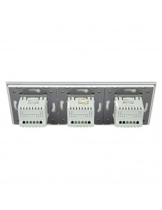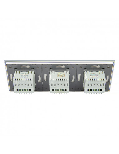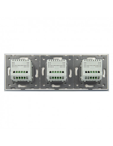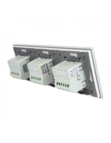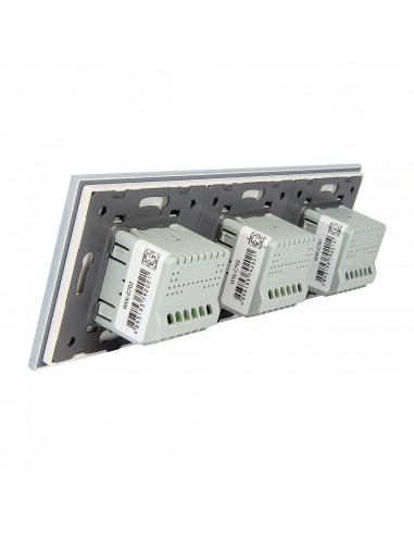 Zestaw składa się z eleganckiego, szklanego panelu dotykowego Livolo, jednego mechanizmu włącznika pojedynczego WW-C701 oraz dwóch mechanizmów włącznika podwójnego Livolo WW-C702 (świecznikowych).