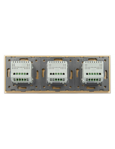 Zestaw składa się z eleganckiego, szklanego panelu dotykowego Livolo, jednego mechanizmu włącznika pojedynczego WW-C701 oraz dwóch mechanizmów włącznika podwójnego Livolo WW-C702 (świecznikowych). Włączniki ustawione są w kolejności: podwójny, pojedynczy, podwójny.