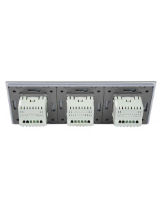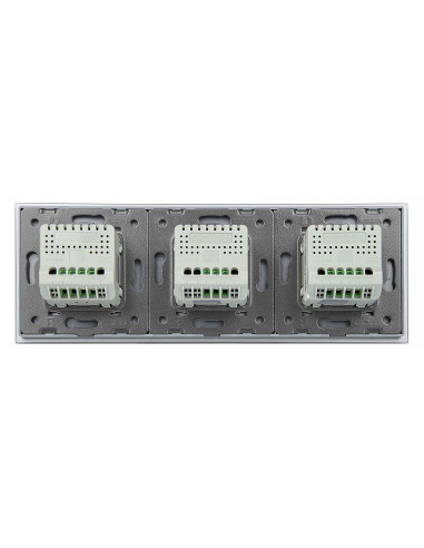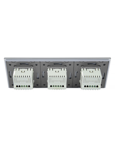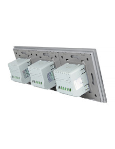 Zestaw składa się z eleganckiego, szklanego panelu dotykowego Livolo, jednego mechanizmu włącznika pojedynczego WW-C701 oraz dwóch mechanizmów włącznika podwójnego Livolo WW-C702 (świecznikowych). Włączniki ustawione są w kolejności: podwójny, pojedynczy, podwójny.