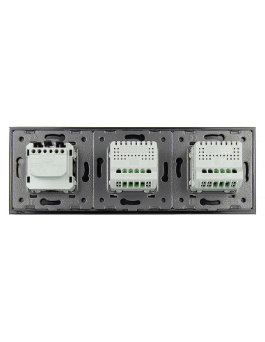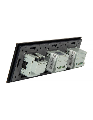 Takie rozwiązanie pozwala na kontrolę aż trzech niezależnych źródeł światła oraz podłączenie jednej wtyczki, a to wszystko za pomocą jednego, zintegrowanego panelu szklanego, który łączy w sobie nowoczesny design, wygodę użytkowania i funkcjonalność. Całość mieści się w trzech puszkach elektrycznych o standardowym rozstawie lub w jednej zespolonej puszce na 3 mechanizmy. Gniazdko posiada boczne uziemienie Schuko, które jest kompatybilne ze wszystkimi wtyczkami dostępnymi na rynku europejskim.