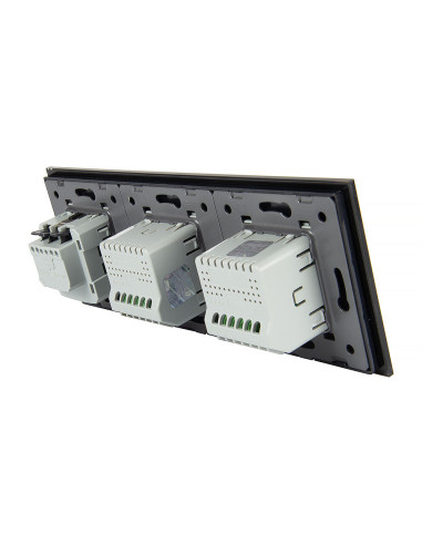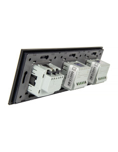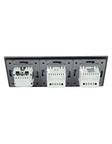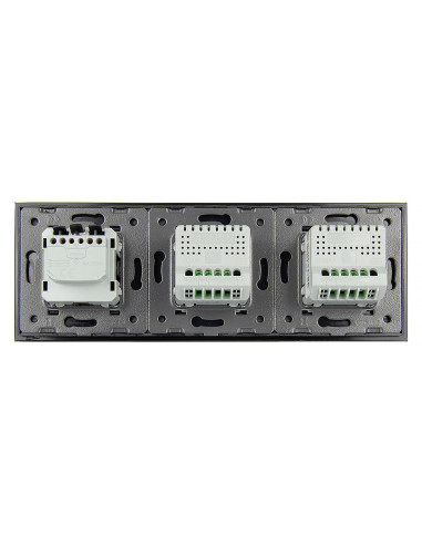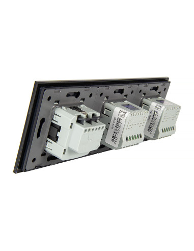 Zestaw składa się z eleganckiego, szklanego panelu dotykowego Livolo, dwóch włączników podwójnych WW-C702 (świecznikowych) oraz jednego wkładu gniazda pojedynczego WG-71EU-S, dopasowanego kolorystycznie do szklanego frontu.