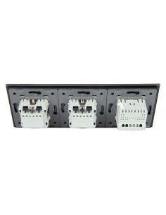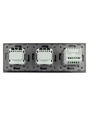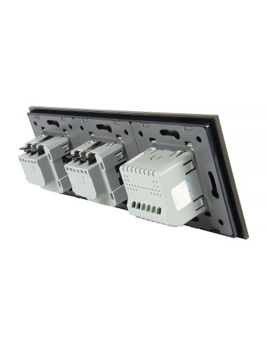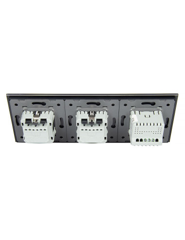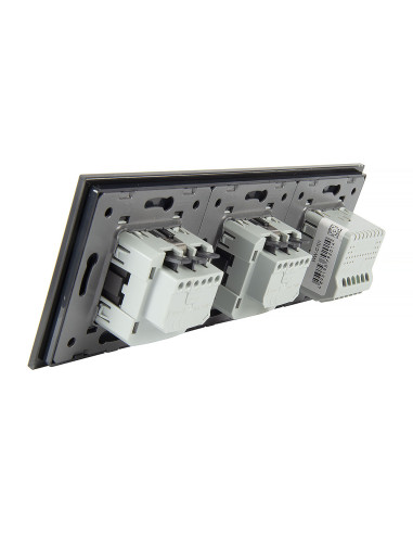 Zestaw składa się z eleganckiego, szklanego panelu dotykowego Livolo, jednego włącznika podwójnego jednego modułu włącznika pojedynczego WW-C701 oraz dwóch wkładów gniazda pojedynczego WG-71EU-S, dopasowanych kolorystycznie do szklanego frontu.