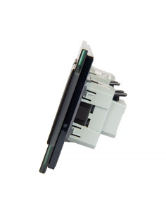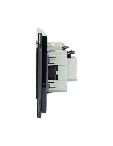 Ten zestaw umożliwia jednoczesne sterowanie jednym obwodem oświetleniowym oraz korzystanie z dwóch gniazd zasilających, a wszystko to w jednym eleganckim panelu wykonanym ze szkła. Połączenie estetyki i praktyczności sprawia, że panel idealnie wpisuje się w nowoczesne wnętrza, zapewniając wygodę codziennego użytkowania. Montaż możliwy jest w trzech standardowych puszkach instalacyjnych o typowym rozstawie lub w jednej potrójnej puszce zespolonej. Zainstalowane gniazdo wyposażono w boczne uziemienie typu Schuko, kompatybilne ze wszystkimi wtyczkami.