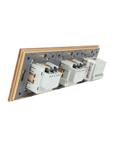 Zestaw składa się z eleganckiego, szklanego panelu dotykowego Livolo, jednego włącznika podwójnego jednego modułu włącznika pojedynczego WW-C701 oraz dwóch wkładów gniazda pojedynczego WG-71EU-S, dopasowanych kolorystycznie do szklanego frontu.