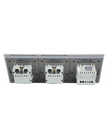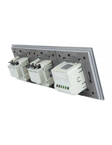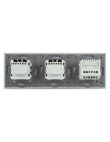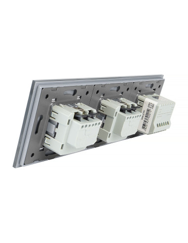 Zestaw składa się z eleganckiego, szklanego panelu dotykowego Livolo, jednego włącznika podwójnego jednego modułu włącznika pojedynczego WW-C701 oraz dwóch wkładów gniazda pojedynczego WG-71EU-S, dopasowanych kolorystycznie do szklanego frontu.