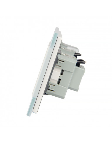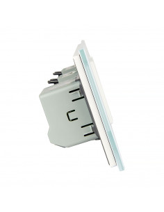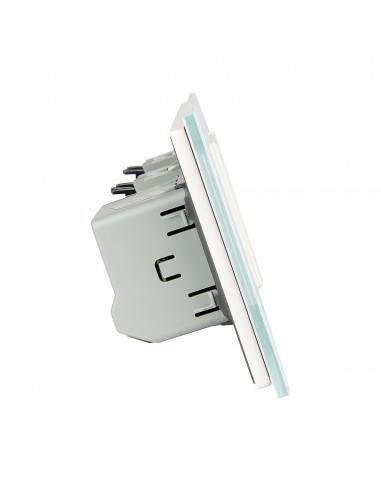 To praktyczne rozwiązanie pozwala na jednoczesne sterowanie dwoma oddzielnymi obwodami oświetleniowymi oraz korzystanie z dwóch gniazd zasilających, a wszystko to w ramach jednego eleganckiego, szklanego panelu. Konstrukcja łączy nowoczesny wygląd z wysoką funkcjonalnością i wygodą użytkowania. Cały zestaw można zamontować w trzech standardowych puszkach elektrycznych o typowym rozstawie lub w jednej potrójnej puszce zespolonej. Gniazdko wyposażono w boczne uziemienie typu Schuko, zgodne ze wszystkimi wtyczkami stosowanymi na naszym rynku. Dodatkowo włączniki posiadają podświetlenie: świecą na niebiesko, gdy są wyłączone, i na czerwono, kiedy pozostają włączone.