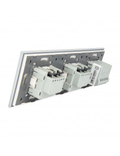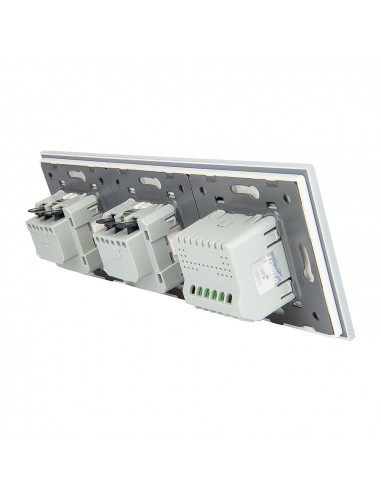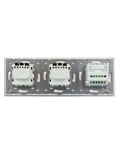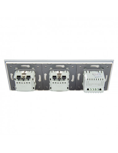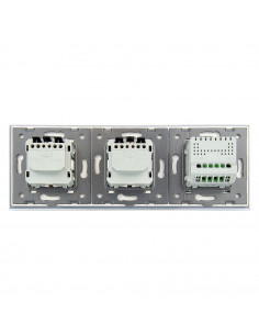 Zestaw składa się z eleganckiego, szklanego panelu dotykowego Livolo, jednego włącznika podwójnego WW-C702 (świecznikowego), dwóch wkładów gniazda pojedynczego WG-71EU-S, które są do kolorystycznie do szklanego frontu.