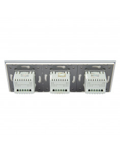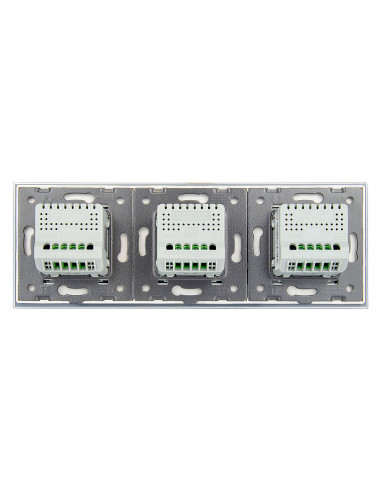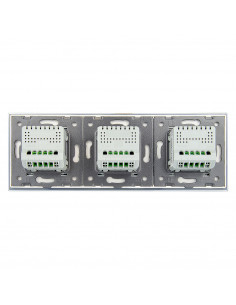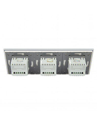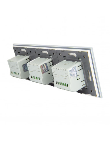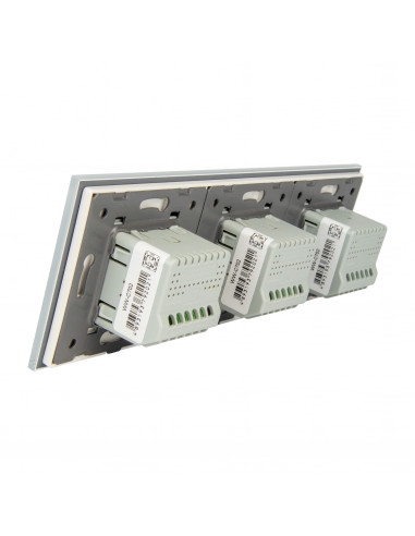 Zestaw składa się z eleganckiego, szklanego panelu dotykowego Livolo oraz trzech mechanizmów włącznika podwójnego Livolo WW-C702. Każdy z mechanizmów działa jako włącznik podwójny (świecznikowy), co umożliwia niezależne sterowanie dwoma obwodami światła.